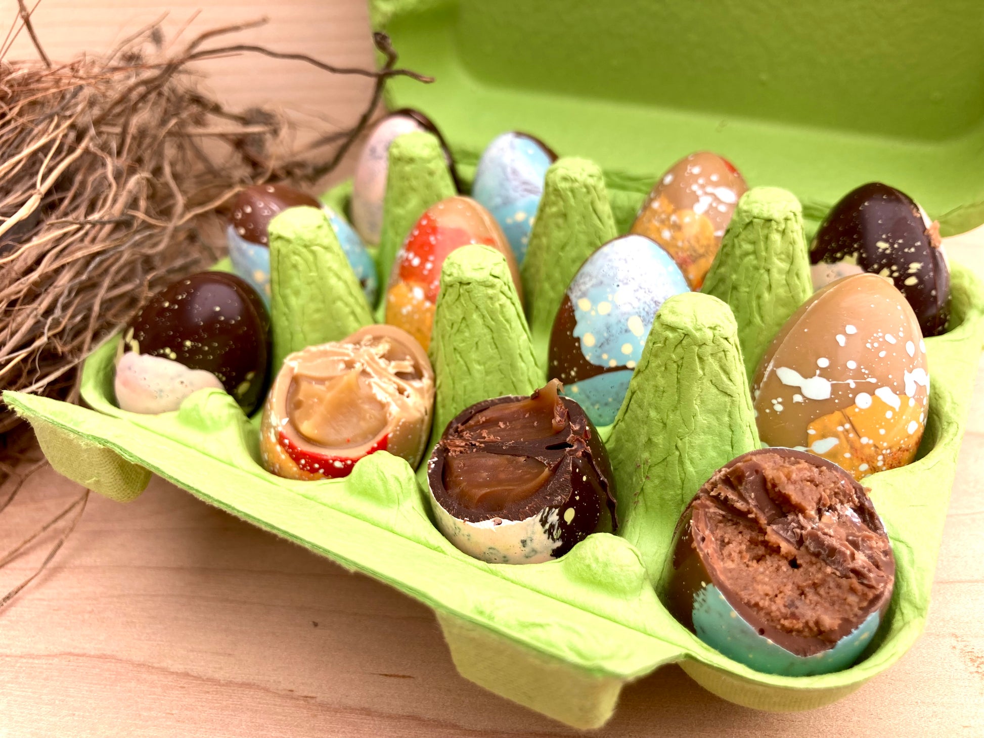 12 petits œufs de cailles en chocolat garnis de praliné noisette et de ganache à l'érable